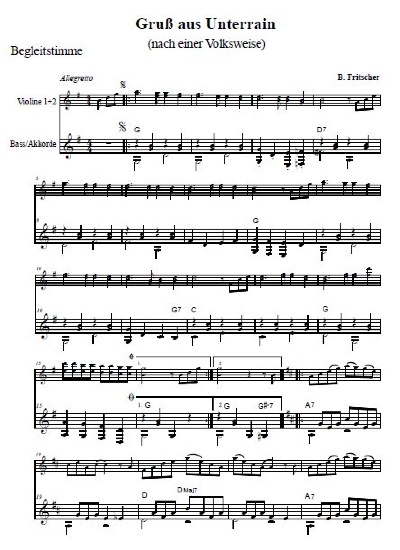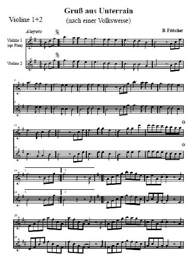 GRUSS AUS UNTERRAIN (Recuerdos de Unterrain) von Bernhard Fritscher im Original für zwei Gitarren (versión original para dos guitarras) hier gesetzt für: (aquí transcrito para) 2 Violinen (oder andere geeignete Melodieinstrumente) 2 violines (u otros instrumentos de melodía idóneos) und Begleitstimmen (Piano, Gitarre, Bass...) y acompa ñ amiento (piano, guitarra, basso...) 2 Violinen (rechts / a la derecha) hier geht's zum Download (click en la "Download" de arriba)