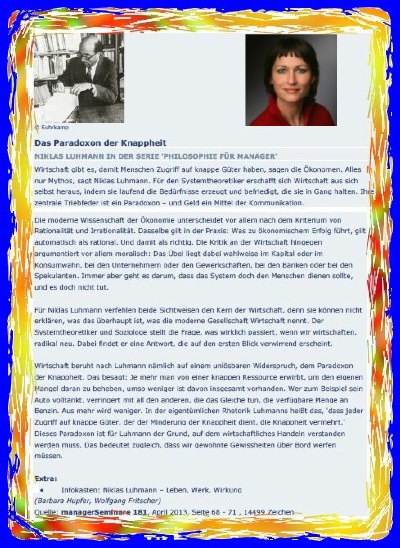 Einen kleinen Text über Niklas Luhmann und dessen paradoxe Sicht auf die Wirtschaft habe ich zusammen mit Barbara Hupfer für die Zeitschrift ManagerSeminare verfasst.